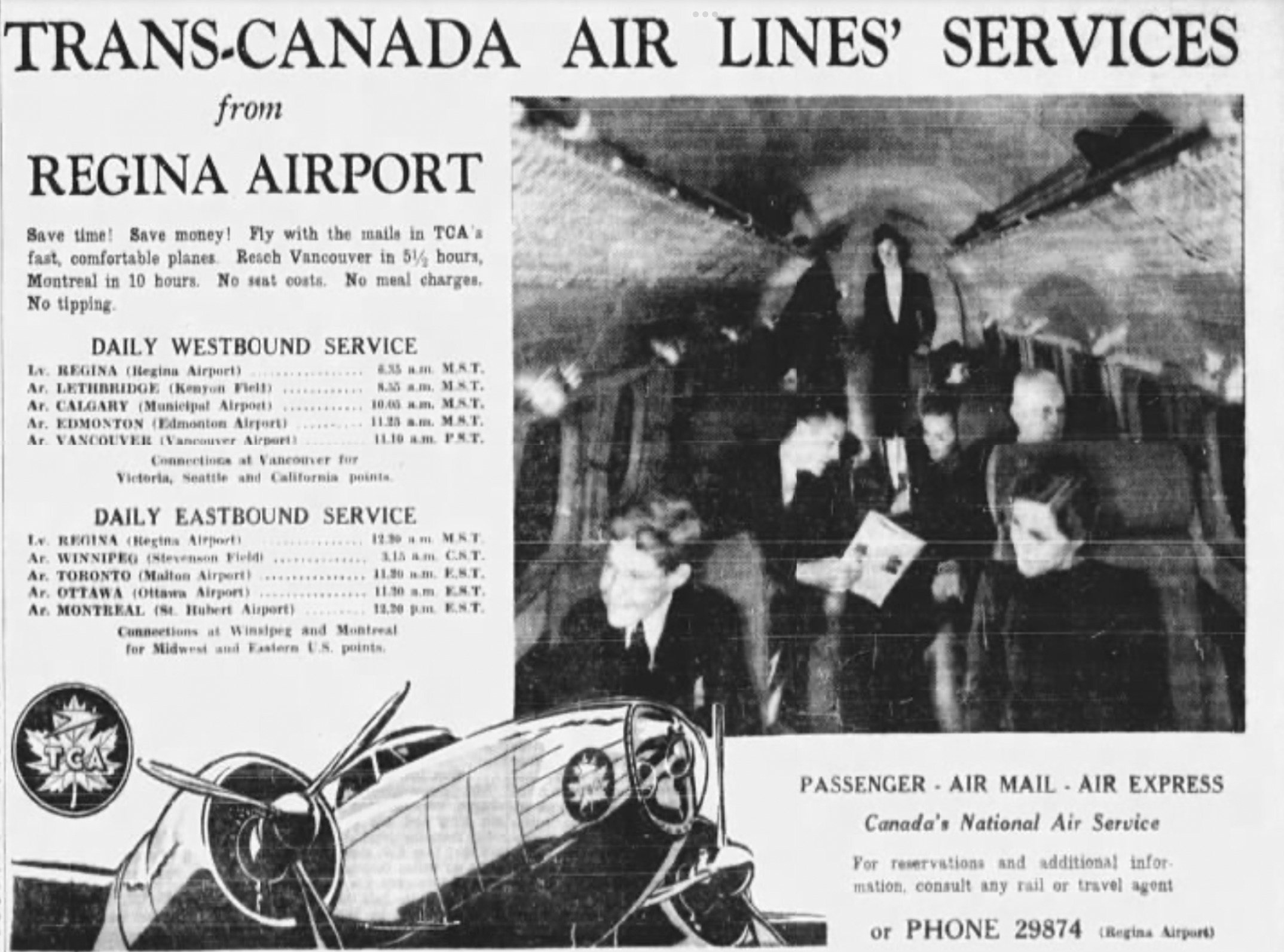 A newspaper clipping with the heading "Trans-Canada Airlines' Services from Regina Airport, with a photo of an aircraft cabin, a TCA plane, and the schedule.